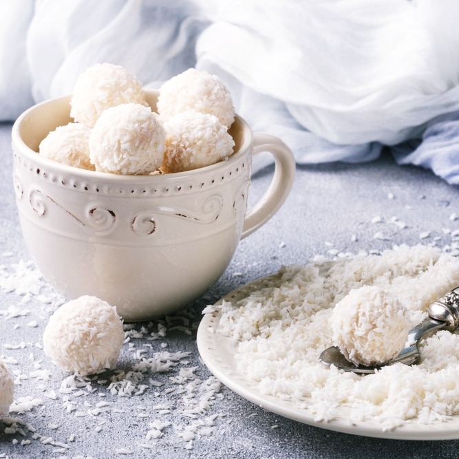 5. Wälzen: Die Kugeln in Kokosraspeln wälzen, bis sie vollständig bedeckt sind.