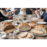 Teilnehmer eines Sauerteigkurses sitzen an einem Holztisch und verkosten verschiedene frisch gebackene Brotvariationen.