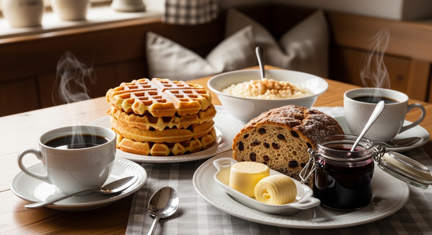 Die Bergische Kaffeetafel ist eine jahrhundertealte Tradition im Bergischen Land – und die Bergischen Waffeln sind ihr Herzstück. Herzförmig, außen knusprig und innen weich, werden sie mit heißen Kirschen und Schlagsahne serviert. In den Waffelstuben rund um Leverkusen ist dieses Ritual lebendig geblieben.