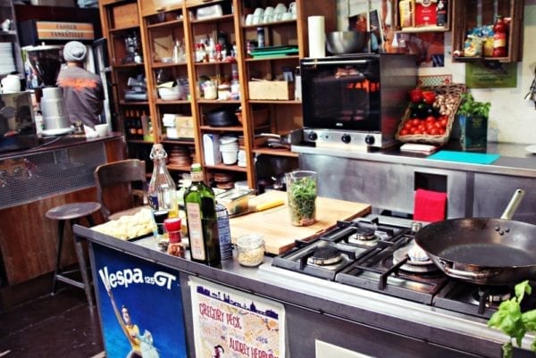 Kochen zwischen Vespas und Werkzeugen! Die Vesbar ist ohne Zweifel ein sehr spezieller Veranstaltungsort für Food-Events. Viele sind vermutlich erst einmal skeptisch, wenn sie die Vespa-Werkstatt betreten und fragen sich, wo und wie hier ein Kochkurs satt finden soll. Aber schon nach wenigen Minuten an der industrie-schicken Bar oder in der netten kleinen Show-Küche mit dem Entertainer und Gastgeber Raffaele Trongone werdet ihr blitzschnell warm mit der extraordinären Location. Spätestens wenn die ersten verführerischen Düfte von Salbei, gedünstetem Gemüse und Basilikum aufsteigen, fühlt ihr euch wie in Neapel. Und eine herrlich angenehme Lockerheit und eine große Lust zu essen, kochen, trinken und reden macht sich breit. Genießt in der Vespar spannende und unvergessliche Stunden.