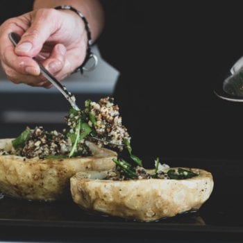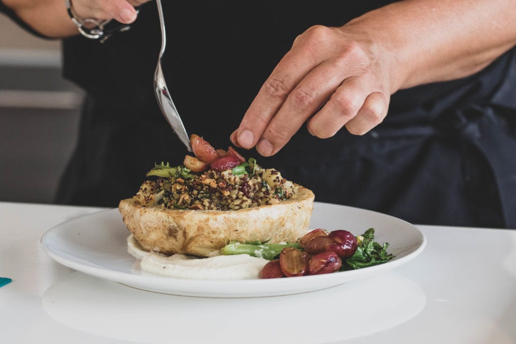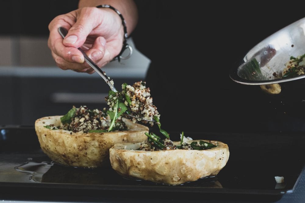 Wir haben Theresa & Kirsten in ihrer schönen Kochschule SOUTHkitchen in Berlin besucht und gefragt, ob sie eine festliche Alternative zu Weihnachtsgans und Schweinebraten haben. Haben Sie! Und was für eine. Kirsten legt gleich los und bereitet für uns einen fantastischen Knollensellerie mit nussig-würziger Füllung und gebratenem Salat im Ottolenghi-Style zu. Nicht nur Vegetarier werden dieses Gericht lieben, auch Fleischfreunden wird bestimmt nichts fehlen. Wer sich Plant Based ernährt, versucht auf tierische Produkte, stark verarbeitete Lebensmittel, überflüssige Fette und Zucker zu verzichten und die Pflanzen möglichst komplett zu verwerten. Dabei geht es also nicht mehr nur darum, kein Fleisch zu essen, sondern sich gesund und nachhaltig zu ernähren. Auf Ersatzprodukte wird verzichtet. Pflanzliche Produkte stehen im Zentrum und sind nicht mehr bloße Sättigungsbeilage. Vor allem geht es Kirsten und Theresa aber um Genuss, gute Produkte und nachvollziehbare Rezepte. Und genau das ist ihnen mit diesem unverschämt leckeren Knollensellerie aus dem Backofen hervorragend gelungen. Seht euch das Rezept oder unser Rezept-Video an und kocht es Schritt für Schritt nach. Es lohnt sich sehr!