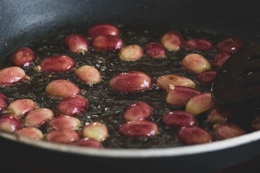 12. Weintrauben in Olivenöl und etwas Zucker karamellisieren.