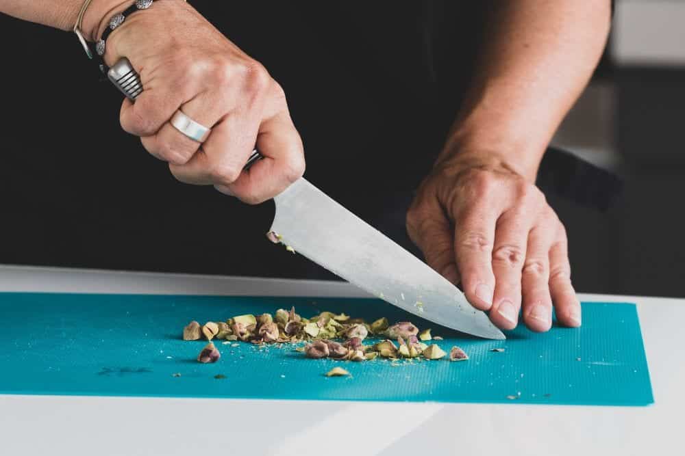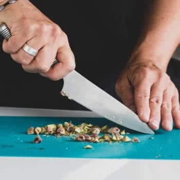 Zur Deko: etwas Frisee-Salat, zwei Handvoll rote, kernlose Weintrauben, Olivenöl, Salz, Pfeffer, eine Hand voll Pistazien, etwas Zucker