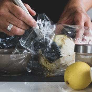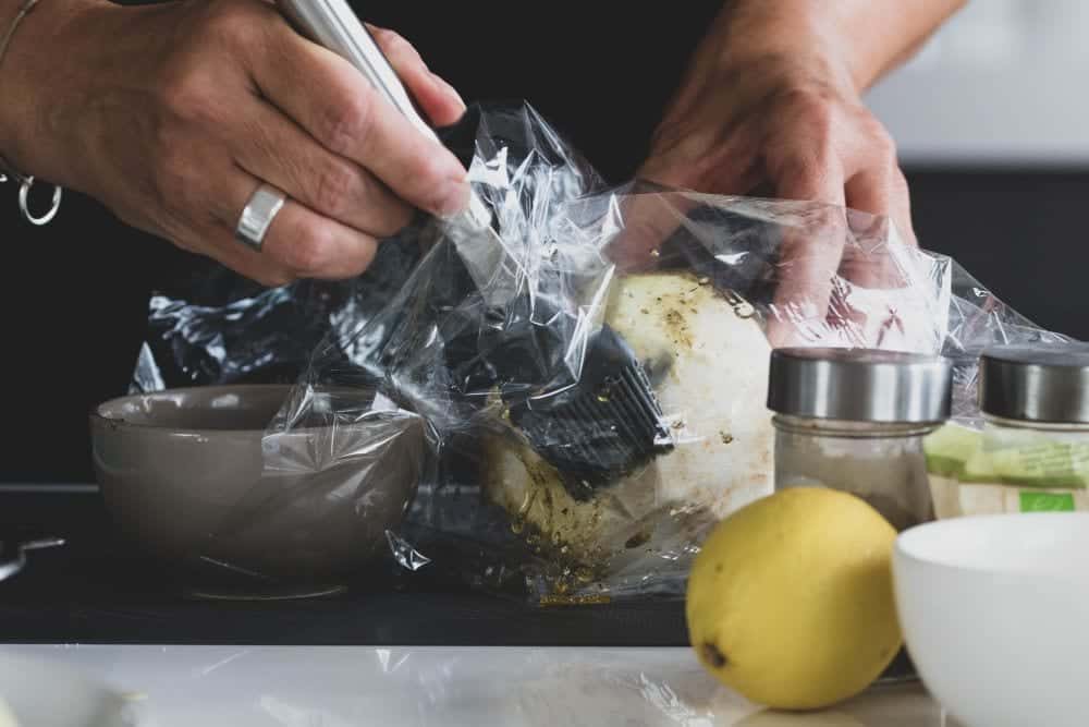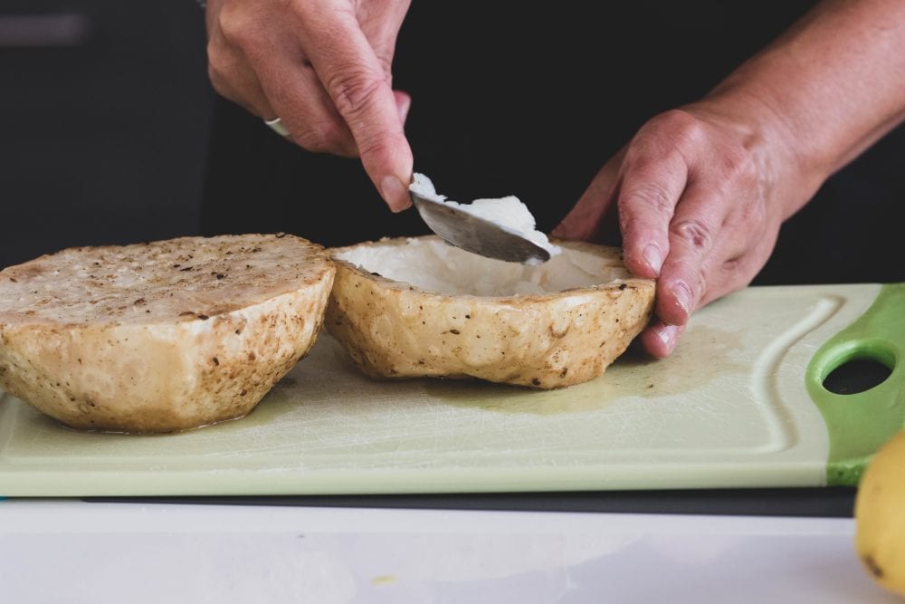 2. Knollensellerie schälen und in einen Bratschlauch packen. Für die Marinade Olivenöl, Salz, Pfeffer und ca. 1 TL Kreuzkümmel mischen und den Knollensellerie bereits im Bratschlauch marinieren. Je nach Größe ca. 30 – 45 Minuten bei 180° im vorgeheizten Ofen im Ofen garen.