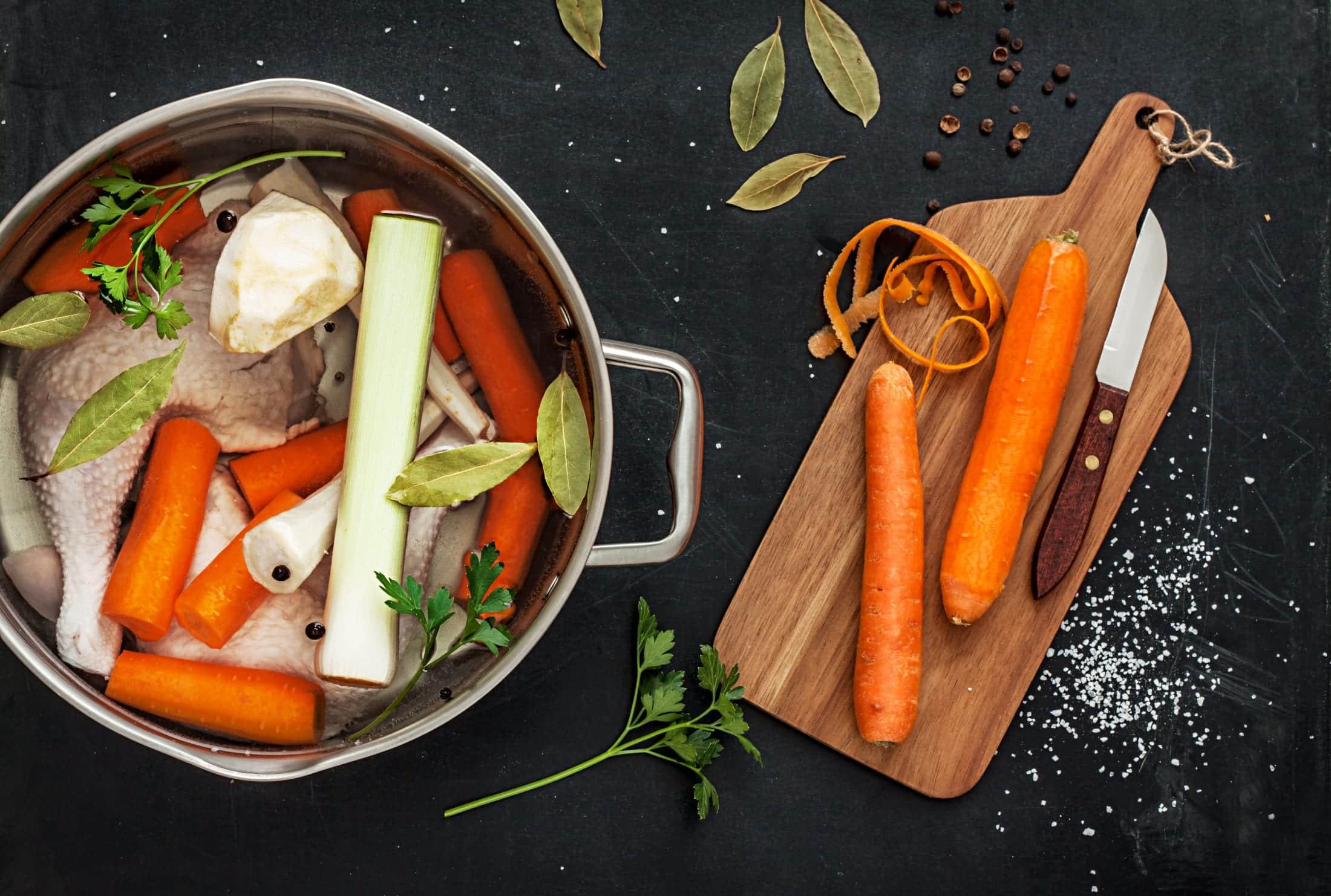 - Huhn, Suppengrün, Lorbeer, Pfefferkörner und Salz für die Geflügelbrühe dazugeben.