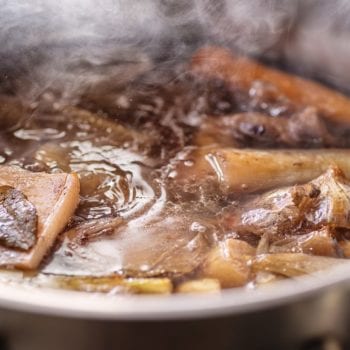- Die Geflügelbrühe aufkochen und ca. 2 Stunden köcheln.