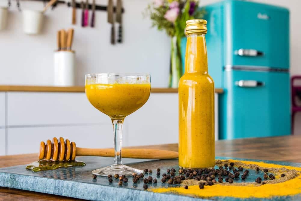 - Ingwer, Zitronensaft, Apfelstücke, 1 TL Kurkumapulver und 1 TL schwarzen Pfeffer in einen Mixer geben und auf höchster Stufe pürieren. Falls dir der Shot zu sauer ist, ein bisschen Honig dazugeben.