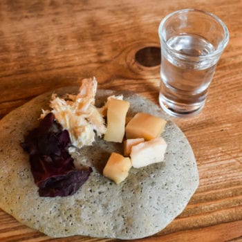 Was steckt drin: fermentierter Hai. Ausgenommener, gesäuberter Grönlandhai, der anschließend in der Erde verbuddelt und mehrere Jahre vor sich hingammelt, bis das Gift verflogen ist.