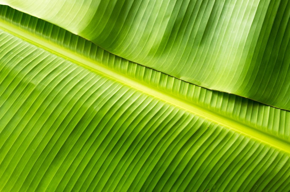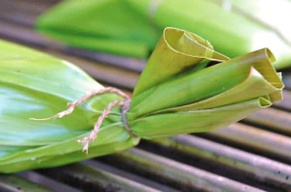 - Das Bananenblatt zuschneiden auf ca. 20*30 cm und kurz für ca. 30 – 60 Sekunden auf den Grill legen – damit werden die Blätter weicher und lassen sich besser verformen.