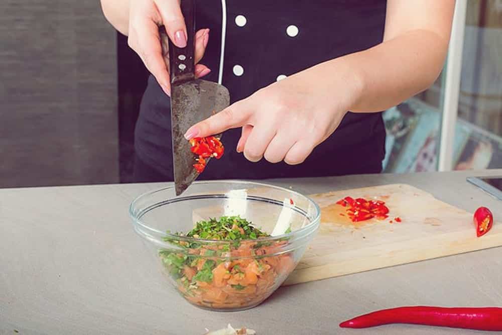 - Schalotten sehr klein, sogar mikroskopisch hacken, aber es sollte nicht zu einem Püree werden – die Knusprigkeit sollte erhalten bleiben. Den Knoblauch zerdrücken. Damit es sein Geschmack abgibt und vollständig in einer fremden Textur verschwindet.