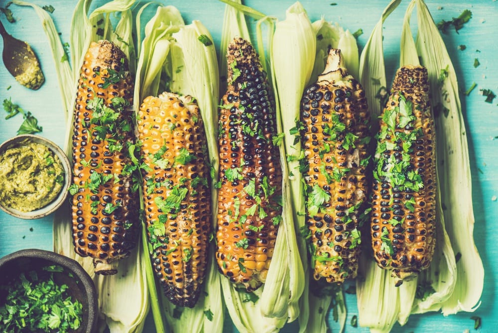 Gehackter Koriander auf gegrilltem Mais