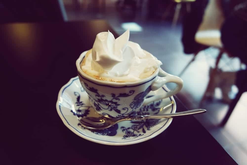 Im Wiener Kaffeehaus – Österreichische Kaffeespezialitäten: Tasse mit Kaffee und viel Schlagsahne