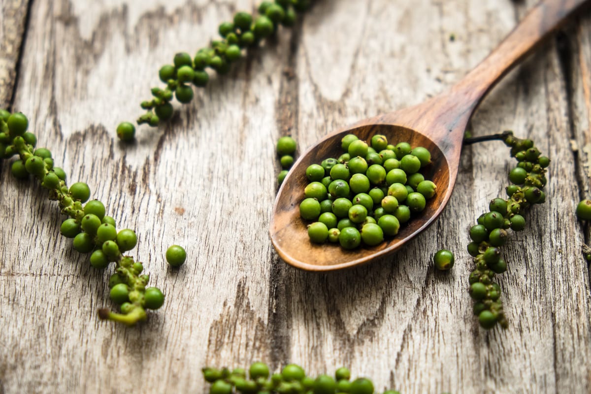 Grün ist der Pfeffer, wenn er noch nicht reif ist. Ein Großteil des Pfeffers wird unreif – also grün geerntet und dann getrocknet – dadurch wird er schwarz. Soll der Pfeffer grün bleiben, muss er sofort in Salzlake eingelegt oder gefriergetrocknet werden. Dadurch wird der Prozess der Fermentation unterbunden – der Pfeffer bleibt deutlich milder. Grüner Pfeffer kann aber auch frisch verwendet werden und ist besonders in der vietnamesischen oder Thai-Küche sehr beliebt. Die grünen Fruchtdolden werden dabei einfach im Ganzen in Currys verwendet.