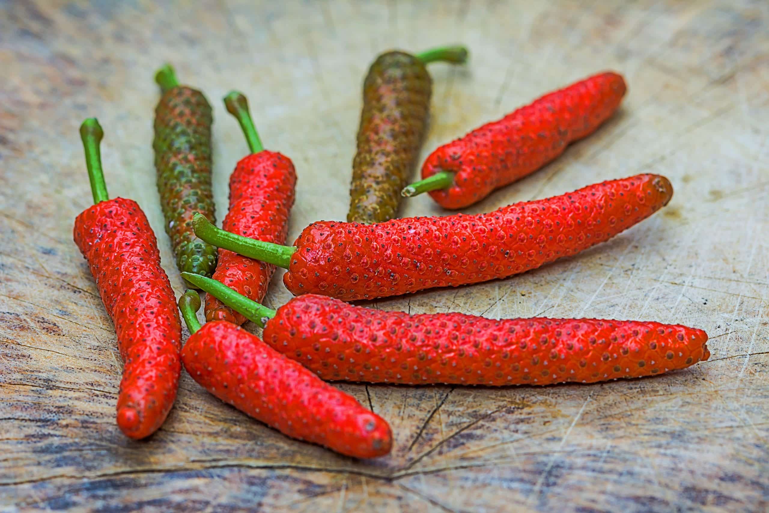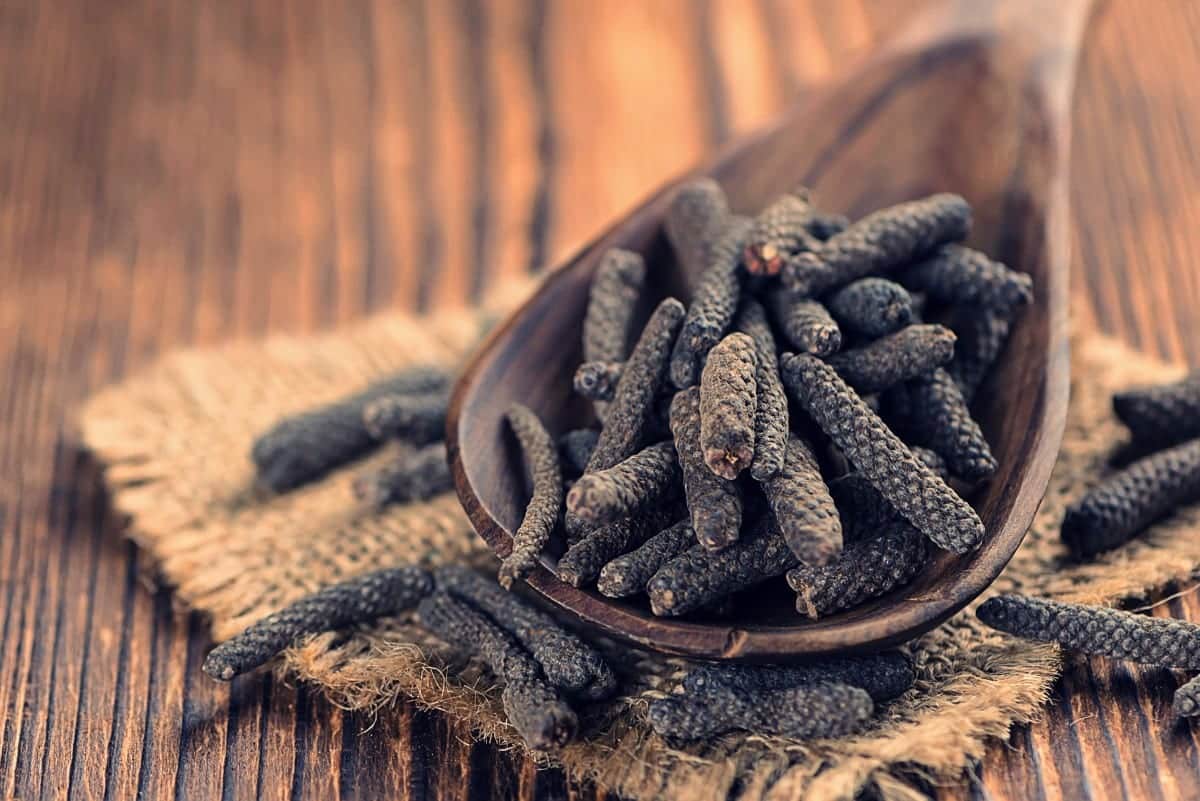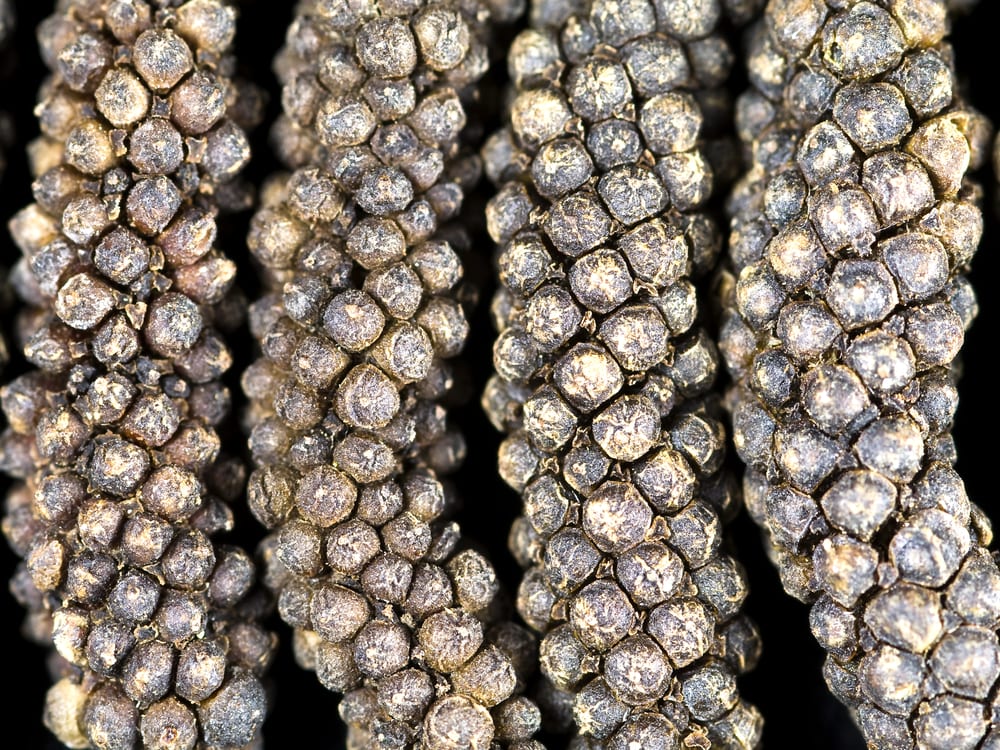 Der zapfenförmige, schuppige Langpfeffer oder auch Bengalische Pfeffer ist die Urform des heutigen Pfeffers. Heute ist er weitgehend in Vergessenheit geraten. Zu Unrecht – denn sein Aroma ist unheimlich aromatisch, schokoladig und fruchtig. Allerdings kann er nicht wie das Pfefferkorn in einer Mühle gemahlen, sondern muss im Mörser zerstoßen werden.