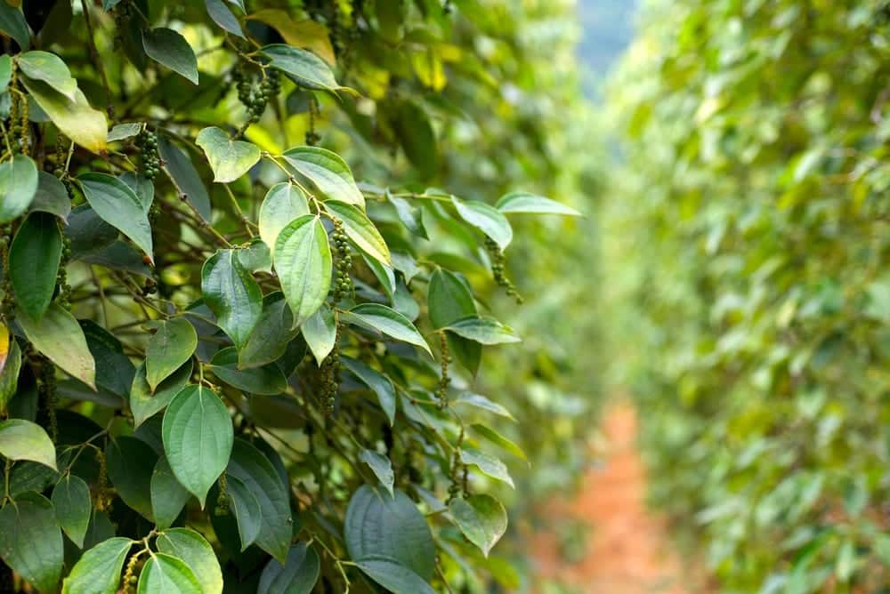 Pfeffer (Piper nigrum) ist eine Kletterpflanze und wächst ein wenig wie unser Hopfen. Die Stauden können dabei bis zu 10 Meter hoch werden. Die Früchte des Pfeffers bilden sich dann an den langen Blütenähren, fast so wie Weintrauben. Ursprünglich stammt der Pfeffer von der Malabar-Küste aus der Provinz Kerala im Südwesten Indiens – die größten Anbaugebiete von Pfeffer liegen heute in Indonesien, Vietnam, Indien und Malaysia. Aus dem Sanskrit hat der Pfeffer auch seinen Namen: „Pippali“ lautet die altindische Bezeichnung für den Pfeffer.