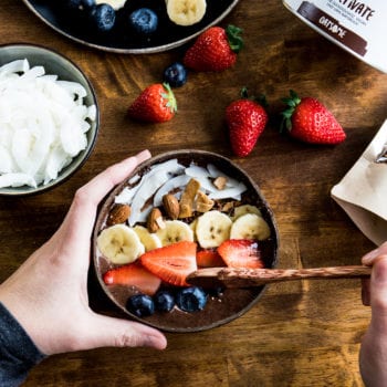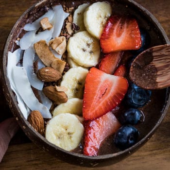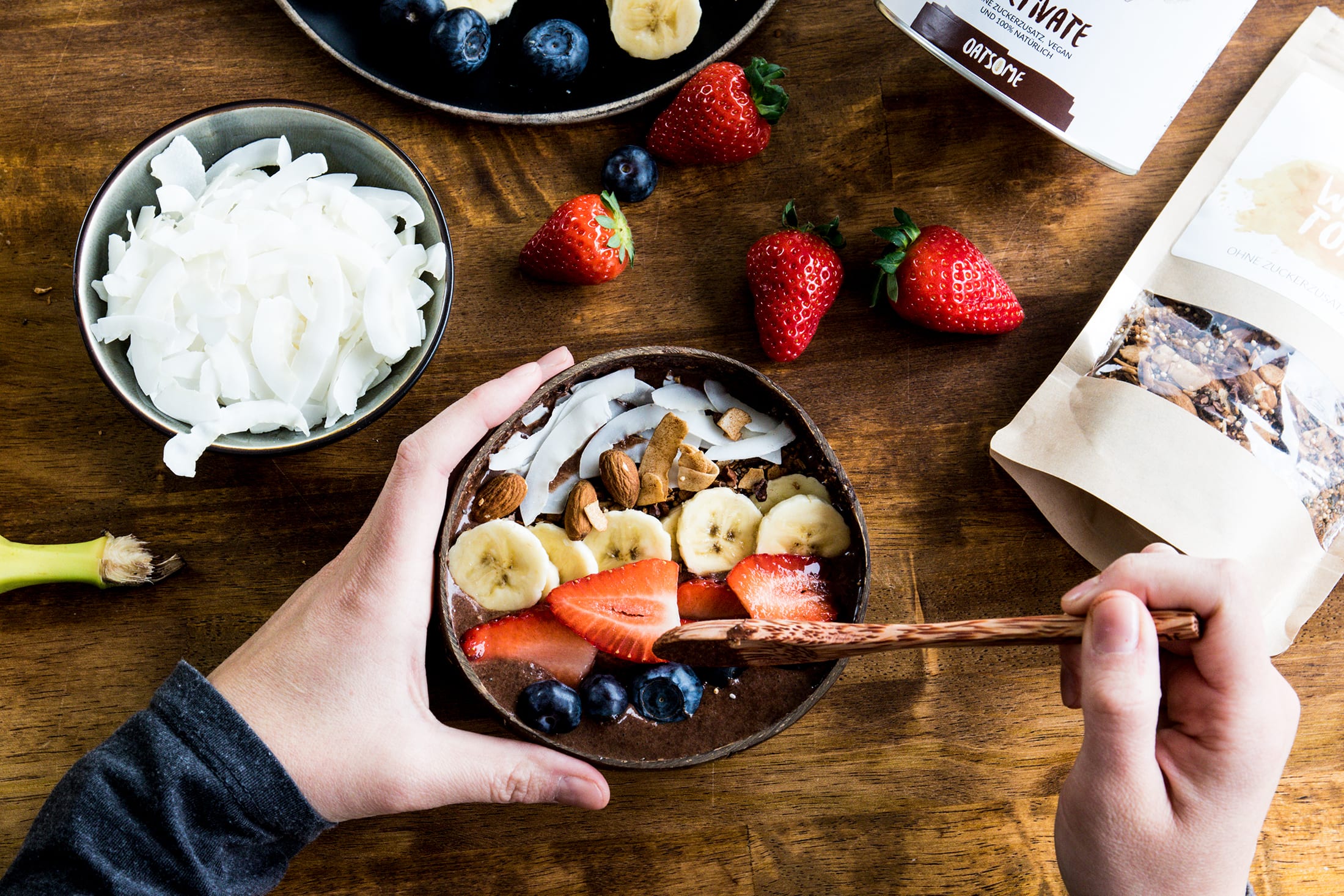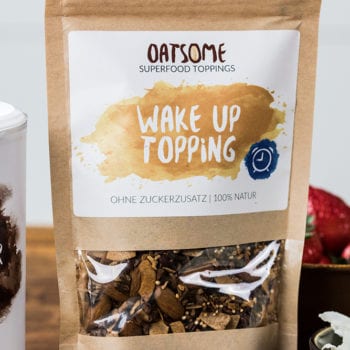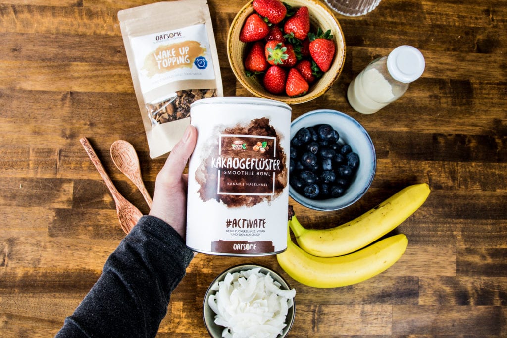 Zutaten (für eine Bowl): 6 EL Oatsome „Kakaogeflüster“, 75 ml Mandelmilch, 75 ml Wasser, Banane, Erdbeeren, Heidelbeeren, Kokosraspeln, Oatsome Topping „Wake up“