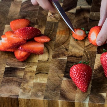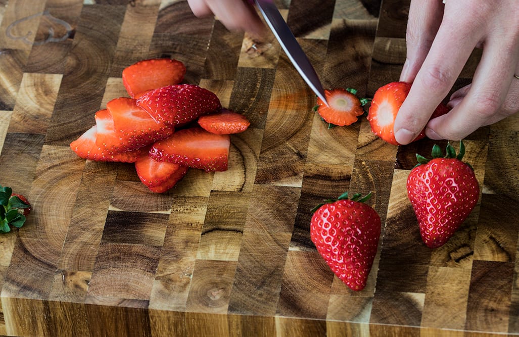 - Einen Mix aus deinen Lieblingsfrüchten je nach Sorte klein schneiden. Wir haben uns für Banane, Heidelbeeren und Erdbeeren entschieden.