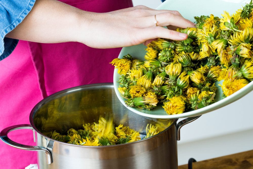Zutaten (zwei Gläser): Zwei oder drei Hände voll Löwenzahn, 1 kg Rohrzucker, 1 L Wasser, ½ Bio-Zitrone (Schale und Saft)