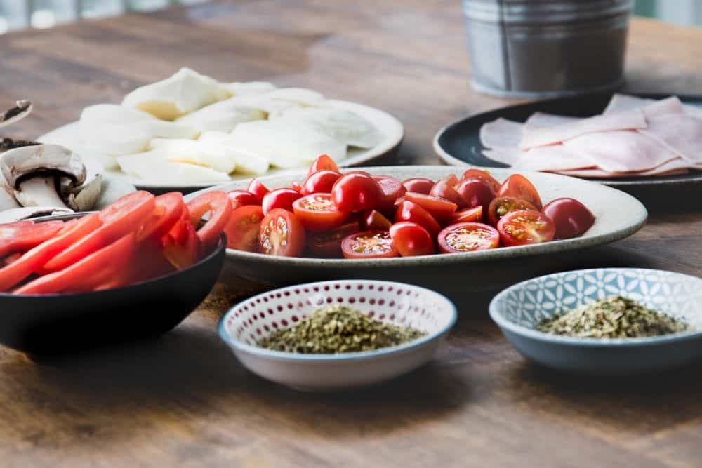 Wir haben unsere zwei Pizzen mit folgenden Zutaten belegt: Ca. 700 ml Tomatensoße, 4 Mozzarella, Eine Paprika, Topf frisches Basilikum, 1 Hand voll Cocktailtomaten, Pizzagewürz, Italienische Kräuter, Meersalz, Schinken, Pilze