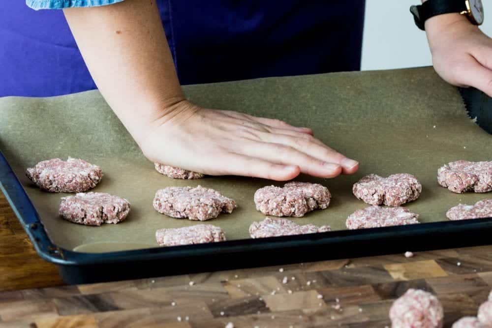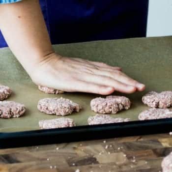 - Kugeln formen und auf einem mit Backpapier belegten Blech mit der Hand platt drücken.
