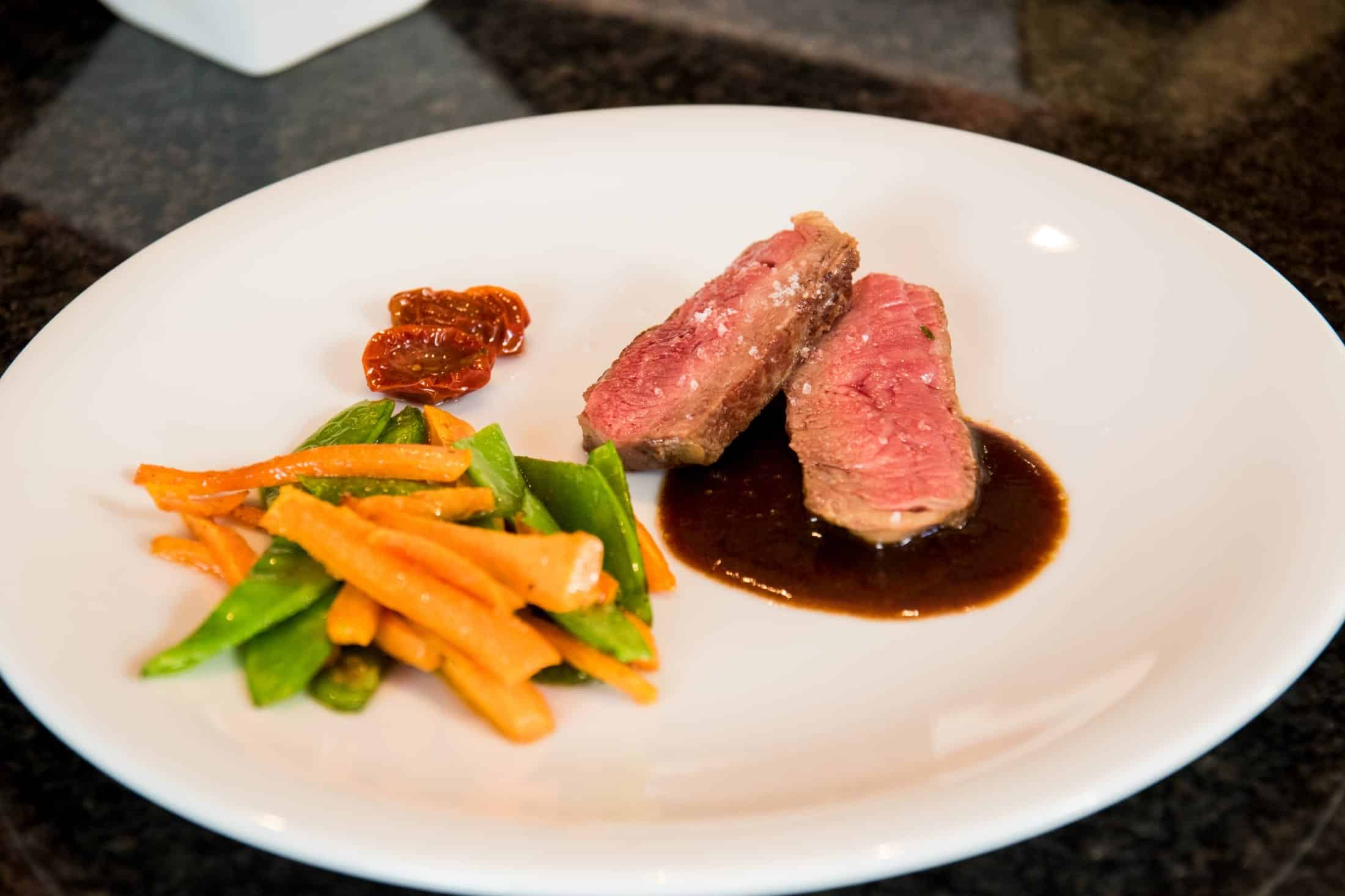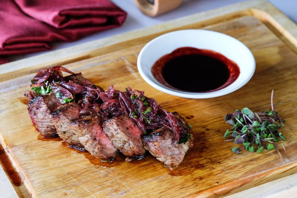 - Zum Schluss abschmecken und eine Prise Zucker oder ein Stück dunkle Schokolade dazugeben. Rotwein-Jus zu einem zarten Stück Fleisch und Gemüse servieren. Fertig!