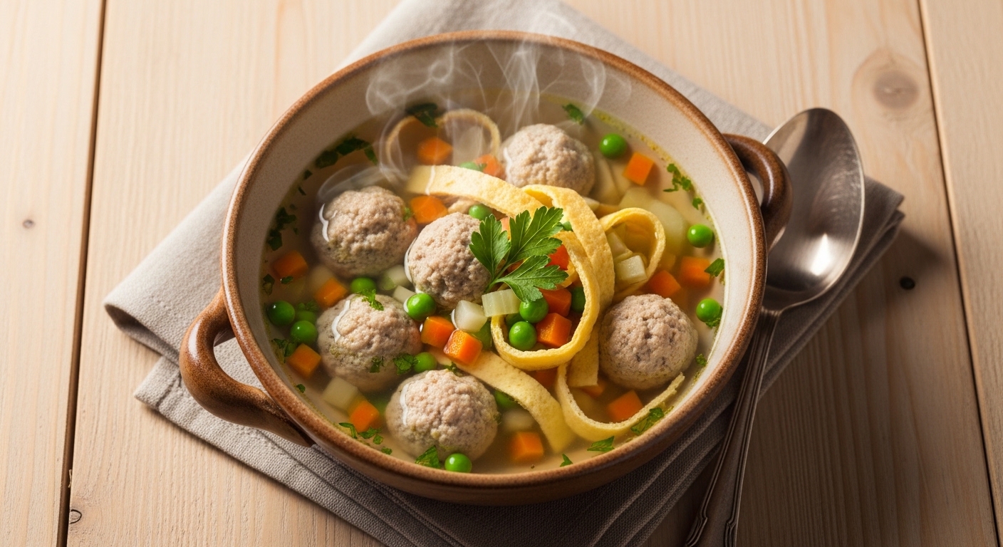 - Servieren: Brühe mit Eierstich, Markkloßchen, Nudeln und gewürfeltem Gemüse anrichten, mit Petersilie bestreuen.