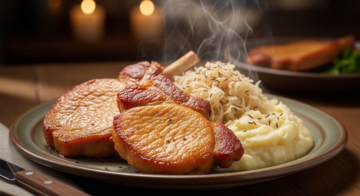 Die Rippchen mit Kraut sind ein hessischer Klassiker – gepökelte Schweinerippchen auf Sauerkraut, traditionell mit Kartoffelpüree serviert.