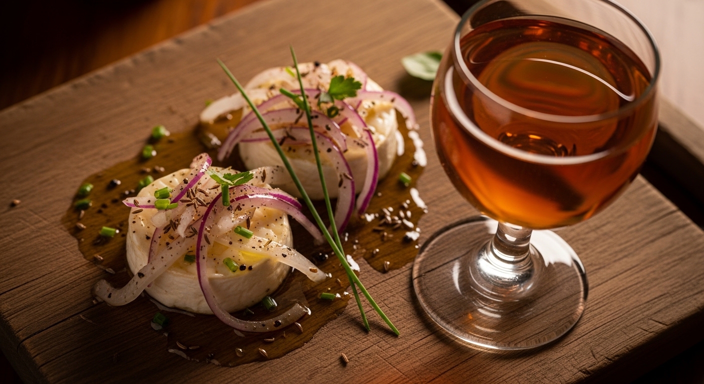 5. Servieren: Handkäs mit Marinade auf Brot servieren, dazu Apfelwein reichen.