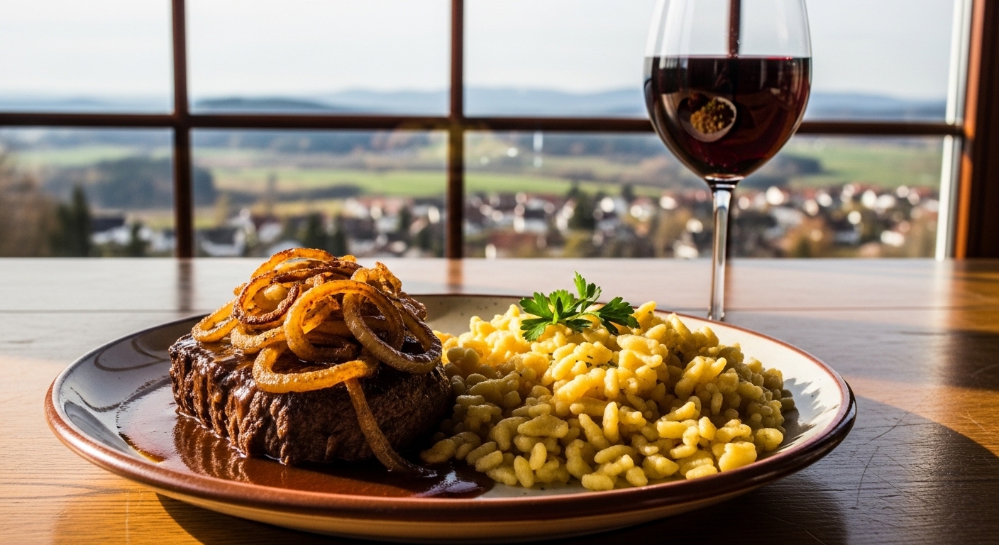 Der Zwiebelrostbraten ist das Festtagsgericht der schwäbischen Küche. Ein saftiges Rostbrief (Rindersteak) wird mit einer Masse goldbrauner Röstzwiebeln bedeckt und in einer kräftigen Bratensauce serviert. In den Gasthäusern rund um Reutlingen und die Schwäbische Alb ist er der unangefochtene König der Speisekarte.