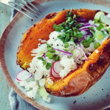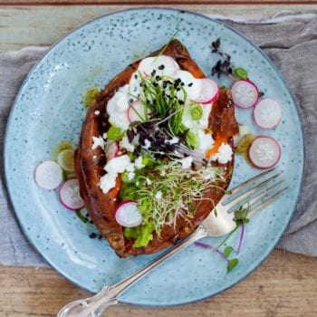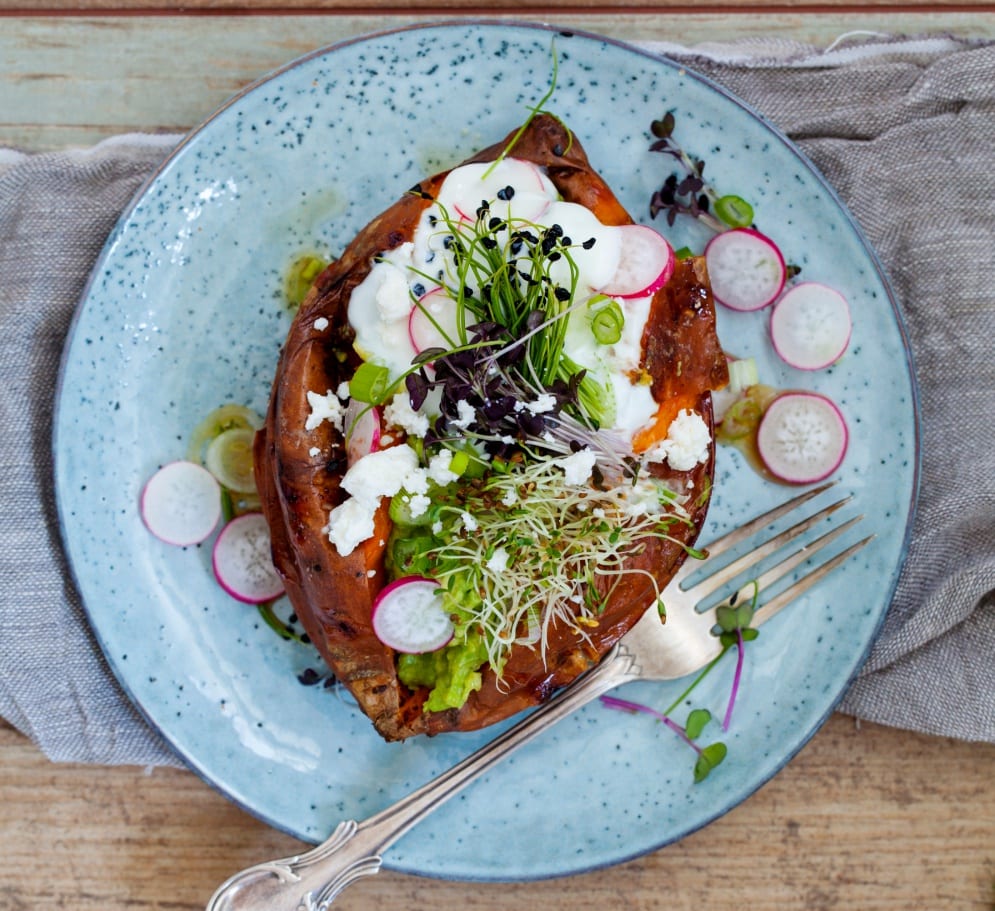 - Süßkartoffeln aus dem Ofen holen und die Avocado-Feta-Creme auf die Hälten verteilen, Sprossen, Radieschenscheiben und Dressing darübergeben und servieren.