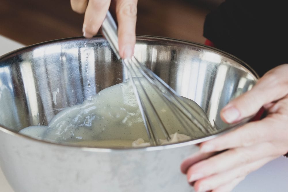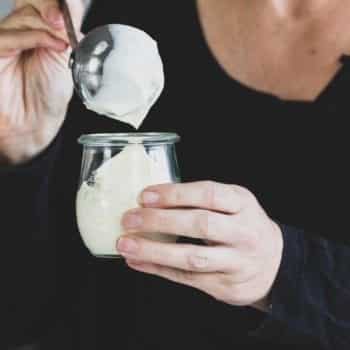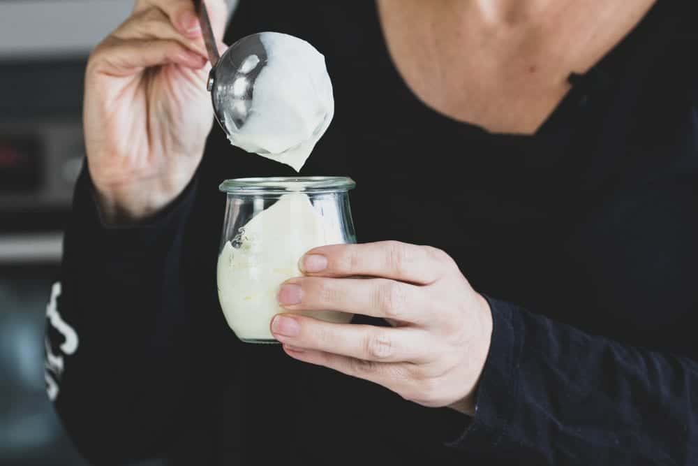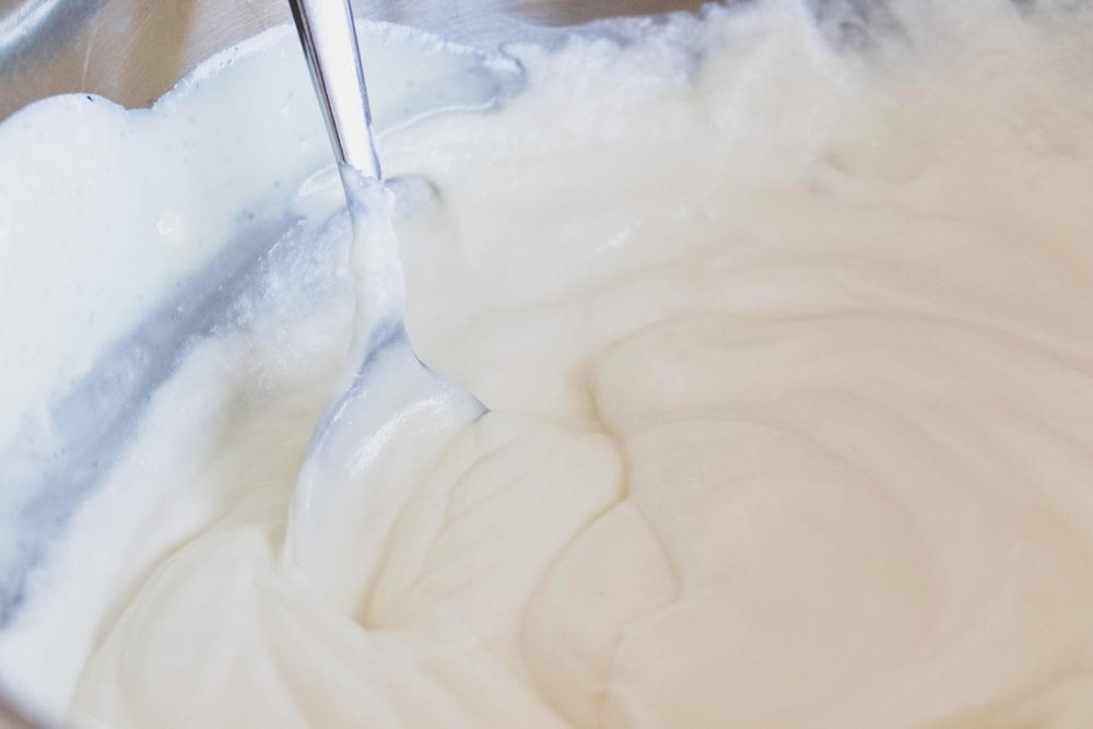 3. Schüssel vom Wasserbad nehmen und Joghurt, Schmand, Vanillezucker und Salz unterheben.