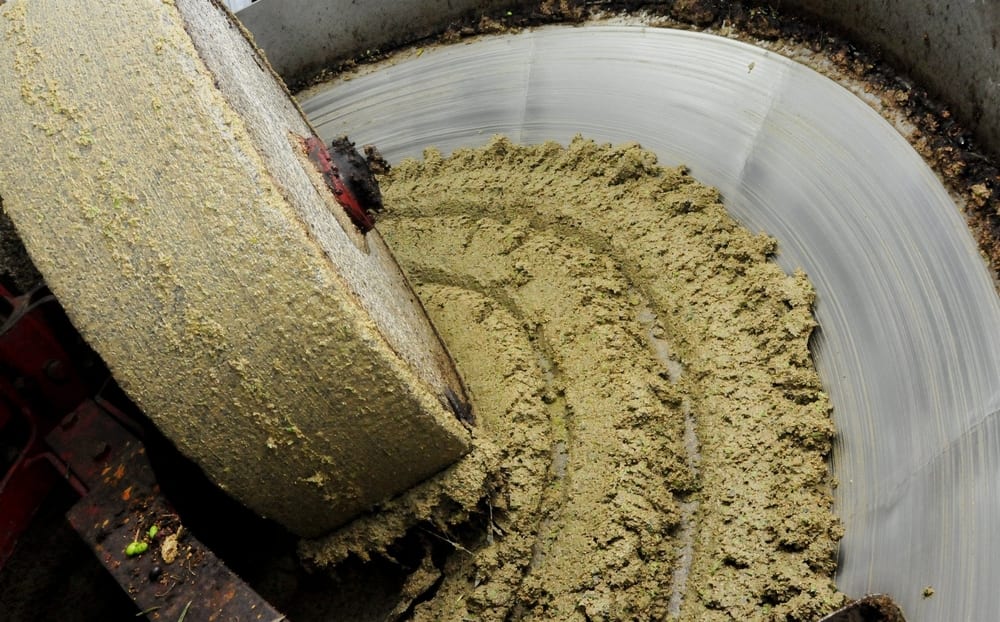 - Dann werden die Oliven samt dem Kern mit einem Mahlstein aus Granit zu einem Brei zerquetscht.