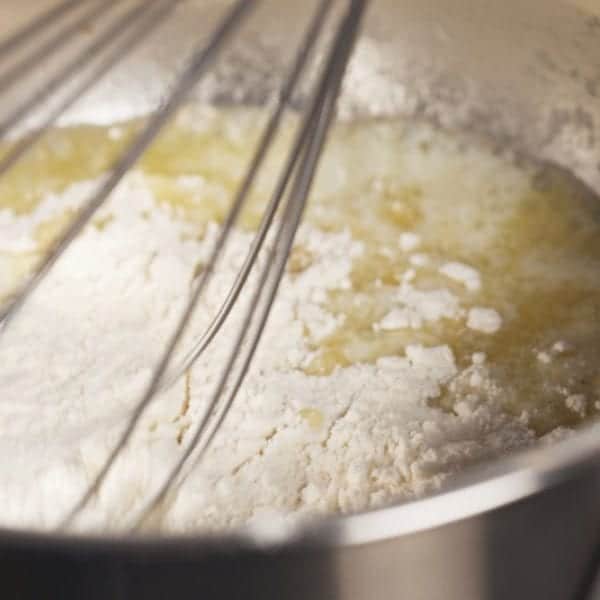 - Mehl unter Rühren dazugeben. Jetzt richtig kräftig rühren und aufpassen, dass das Mehl nicht am Topfboden anbrennt.