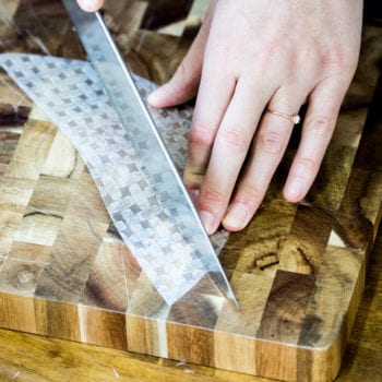 3. Reispapier mit einer scharfen Küchenschere oder einem Küchenmesser in 3 bis 4 cm breite Streifen schneiden.