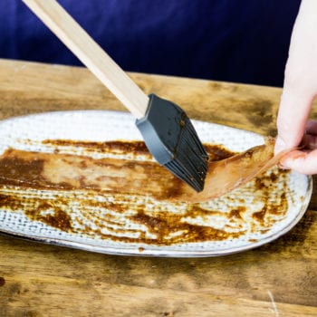 4. Jeweils zwei Streifen kurz unter fließendes, kaltes Wasser halten, aufeinanderlegen und durch die Marinade ziehen.