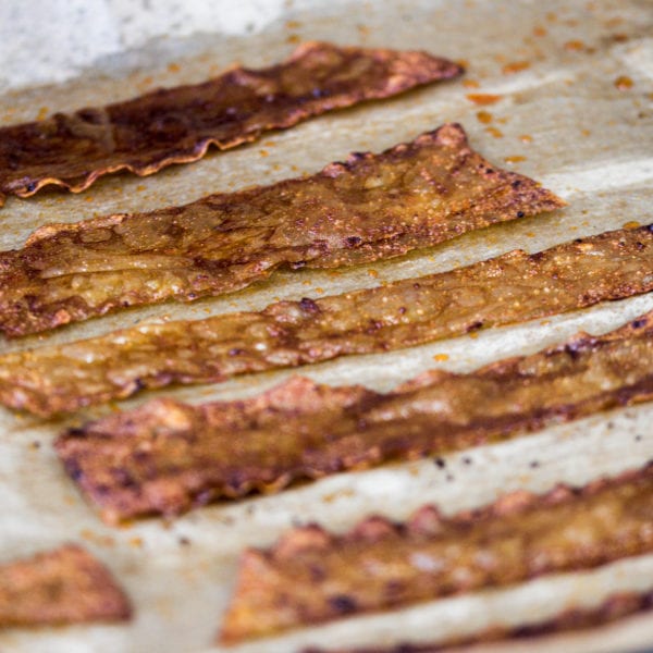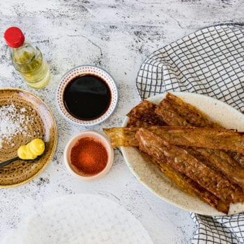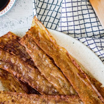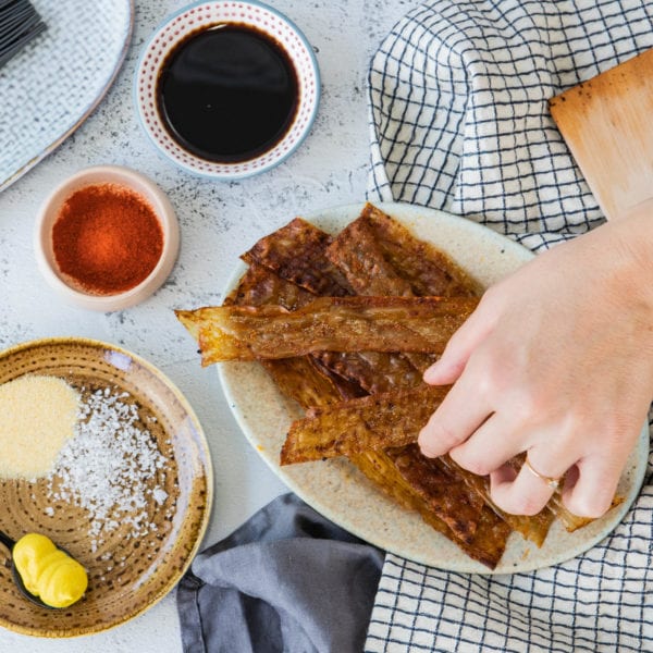 Kein Fleisch, kein Bacon?! Doch – ab jetzt schon! Wir haben eine vegane Variante von knusprigem Frühstücksspeck entdeckt und gleich für euch ausprobiert. Alles, was ihr dazu braucht, sind Reispapierblätter und eine rauchig-feurige Marinade, mit der ihr aus den hauchdünnen Reispapierblättern knusprig, würzige Streifen macht, die auf einem Sandwich mit Avocado oder in einer Bowl mit Edamame, Quinoa und Hummus für Biss und wunderbare Würze sorgen. Es ist unkompliziert und richtig gut!