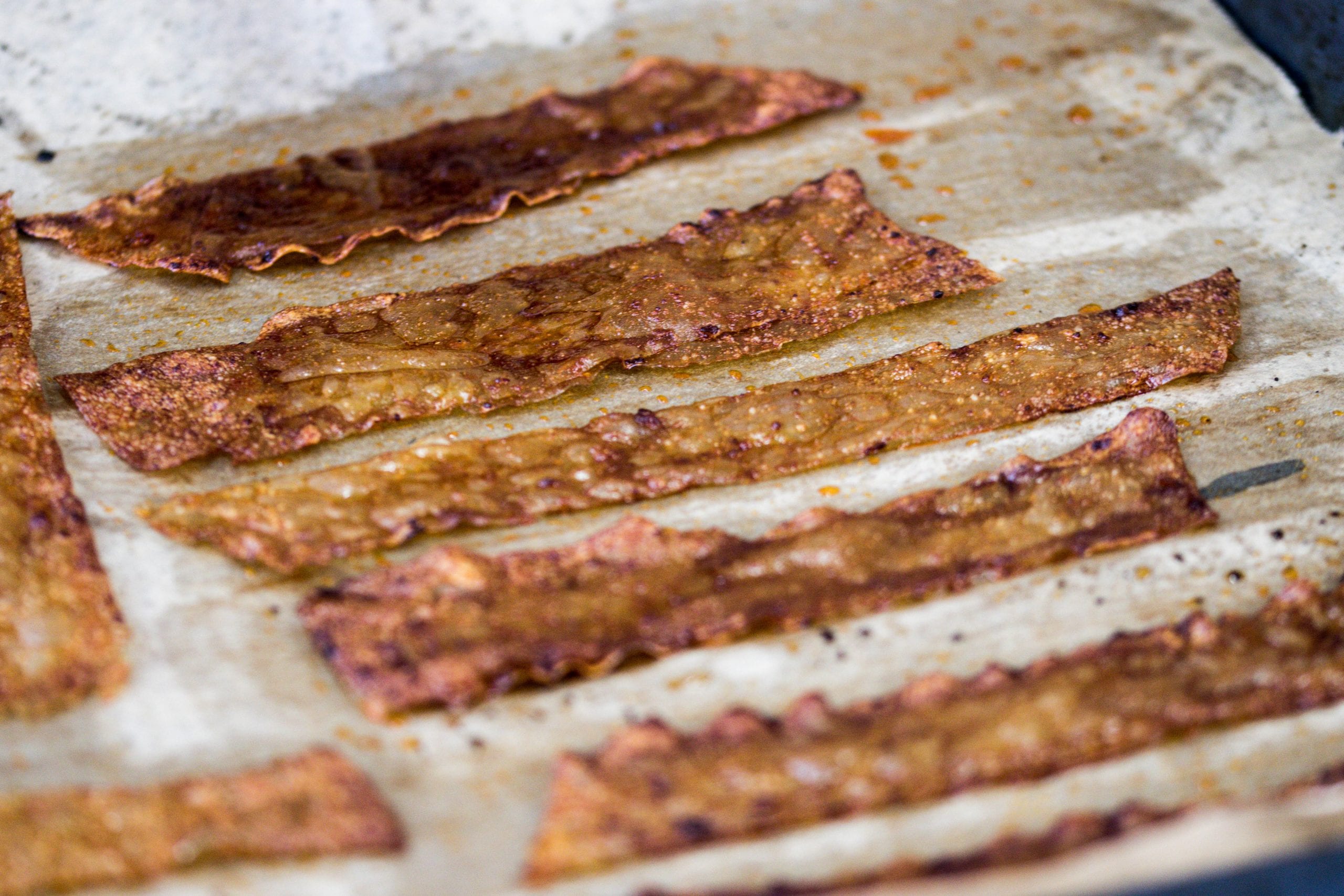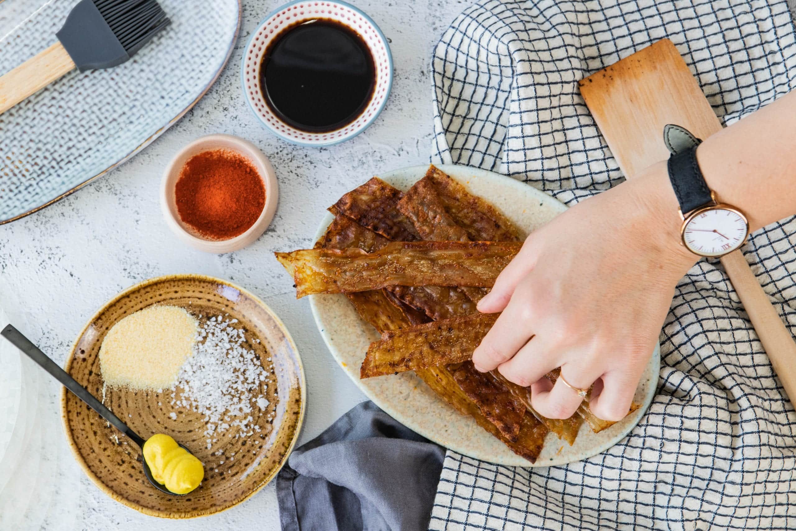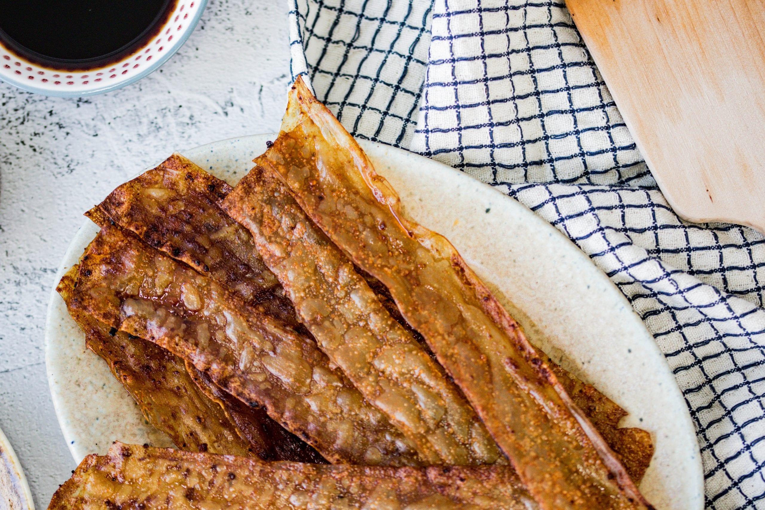Kein Fleisch, kein Bacon?! Doch – ab jetzt schon! Wir haben eine vegane Variante von knusprigem Frühstücksspeck entdeckt und gleich für euch ausprobiert. Alles, was ihr dazu braucht, sind Reispapierblätter und eine rauchig-feurige Marinade, mit der ihr aus den hauchdünnen Reispapierblättern knusprig, würzige Streifen macht, die auf einem Sandwich mit Avocado oder in einer Bowl mit Edamame, Quinoa und Hummus für Biss und wunderbare Würze sorgen. Es ist unkompliziert und richtig gut!