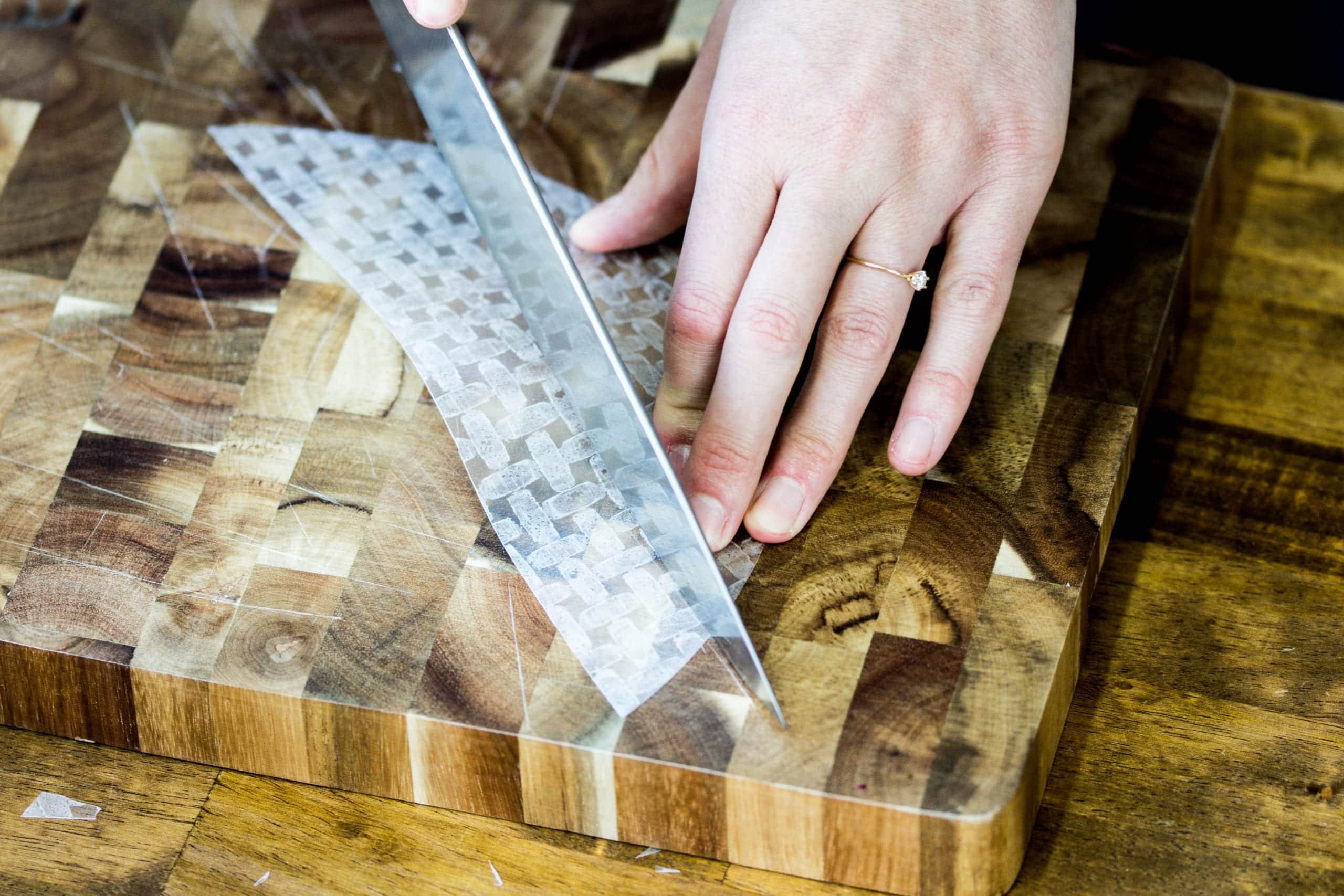 3. Reispapier mit einer scharfen Küchenschere oder einem Küchenmesser in 3 bis 4 cm breite Streifen schneiden.