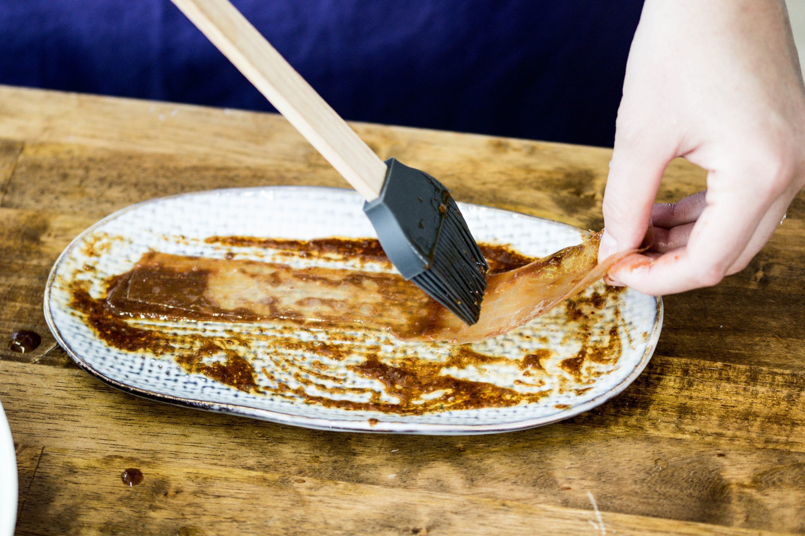 4. Jeweils zwei Streifen kurz unter fließendes, kaltes Wasser halten, aufeinanderlegen und durch die Marinade ziehen.
